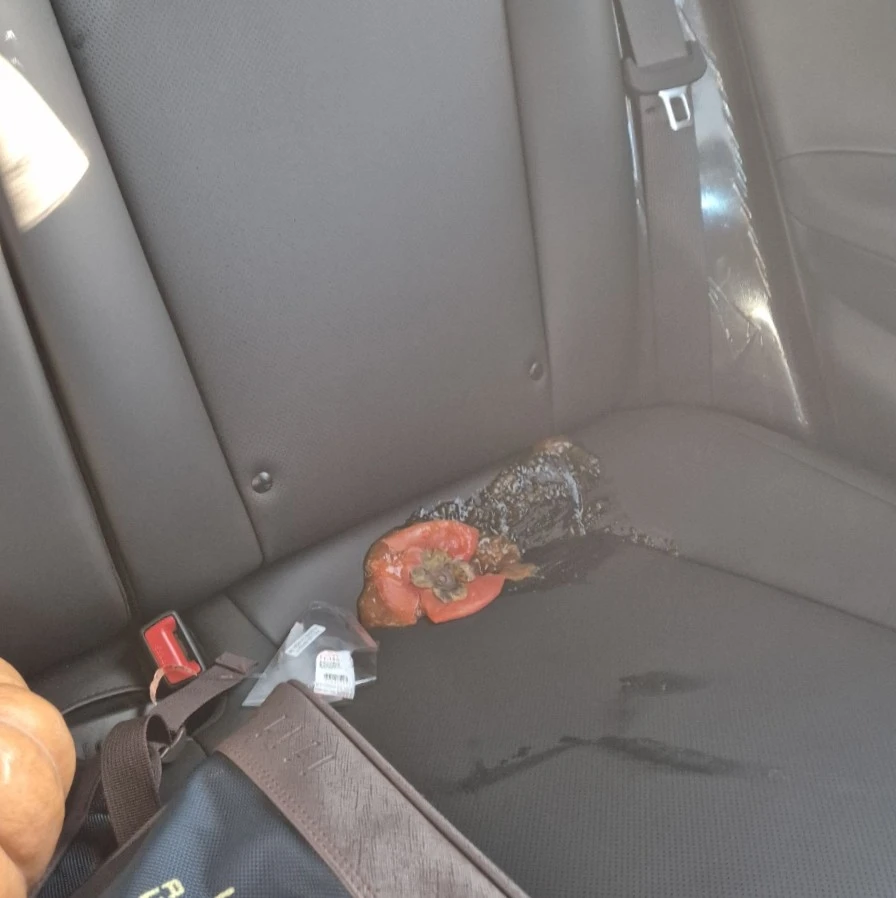 아내가 아이에게 먹이려고 뒷좌석 헤드레스트 뒤에 둔 홍시였다. 아이에게 밥을 먹이느라 좌석에서 등을 떼고 있는 사이, 충격을 타고 내려온 것이었다. 트랩처럼 깔려 있던 홍시는 내 엉덩이가 닿기만을 기다리고 있었고, 회사에 도착할 찰나 작전 성공.