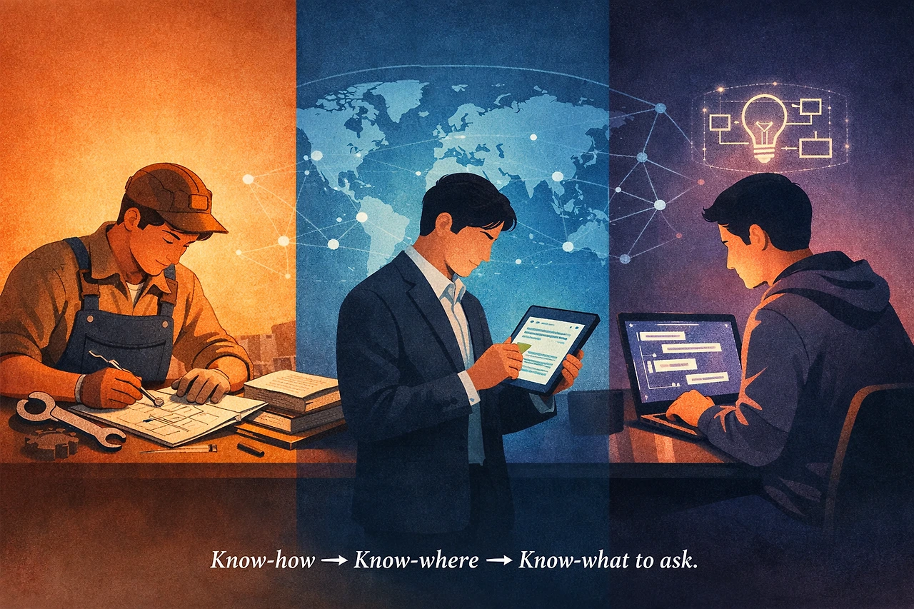 우리는 오랫동안 ‘무엇을 아는가’로 사람을 평가해 왔습니다. 손끝에 기술이 쌓여야 전문가였고, 머릿속 경험이 많아야 관리자가 되었습니다. 그 시절 경쟁력은 개인의 저장 용량, 즉 Know-how였습니다. 지식은 축적되는 자산이었고, 많이 가진 사람이 곧 권력이었습니다.