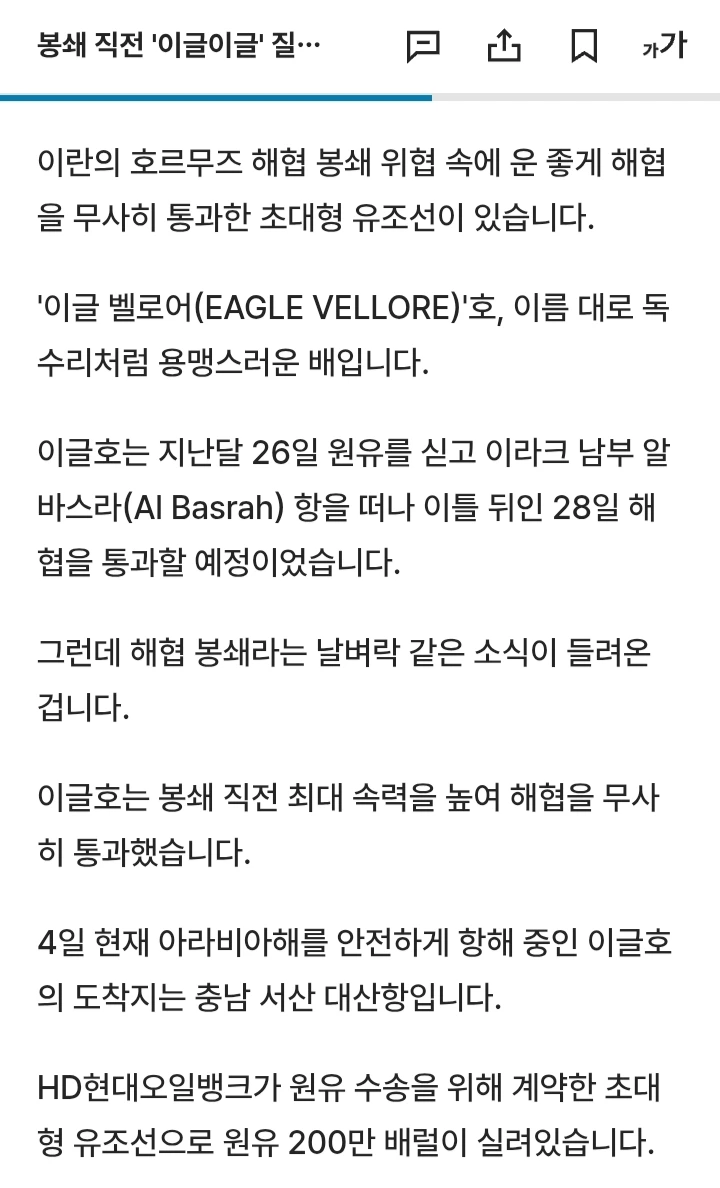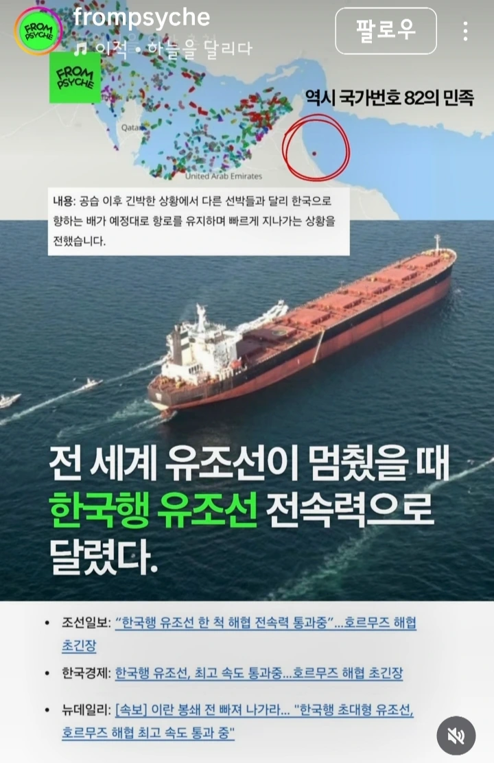 며칠 전 뉴스에서 한 척의 유조선이 화제가 되었다. 호르무즈 해협이 봉쇄된 긴박한 상황 속에서 한국으로 향하던 유조선이 전속력으로 해협을 통과했다는 소식이었다.