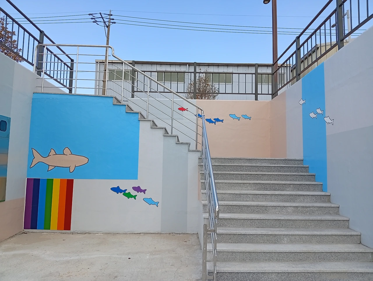 색들은 망설임 없이 서로를 잇는다. 햇빛이 좋은 날에는 그 색들이 주변의 회색빛 공장과 대비되어 유난히 선명하게 도드라진다.