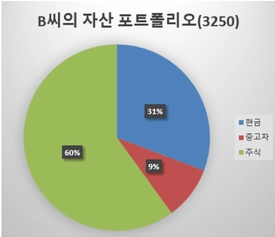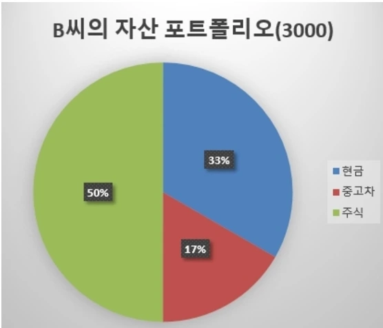 B 씨는 주식에 50%, 1500만 원을 투자했고 중고차는 타다 안되면 버릴 생각으로 500만 원짜리를 구매했다.
