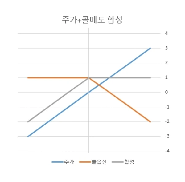 하나 더 만들어 보자, 이번엔 어떤 주식에 대한 옵션을 발행하는데, 아무리 봐도 해당 회사가 건실해 보이지 않는다. 주가가 상승하지 않을 거라고 생각되어 콜옵션 매도(상승보험 판매)를 한다. 그러나 혹시 모를 사태에 가격이 상승할 수도 있으니 이 주식 자체를 매수한다.