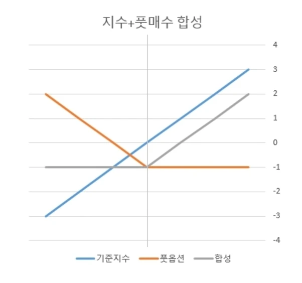 예를 들어보자. 내가 어떤 지수에 투자를 하고 싶은데, 손실은 두렵다. 그래서 보험을 하기 위한 풋옵션 매수(하락보험 가입)를 한다. 이렇게 되면 수익률의 형태가 어떻게 될까?