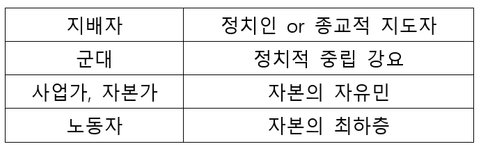 그들을 물리적인 힘을 지니고 있으며 총칼을 들고일어난 혁명의 핵심이기도 하다. 우리나라도 군대가 혁명을 일으켜 박정희, 전두환의 군부역사를 가지고 있으며, 그로 인한 피해도 상당했다. 이런 점에서 지배자는 법안을 만들어 군대는 정치를 할 수 없도록 못 박아 그들의 능력을 거세하고 계급혁명을 일으키지 못하도록 봉쇄했다.