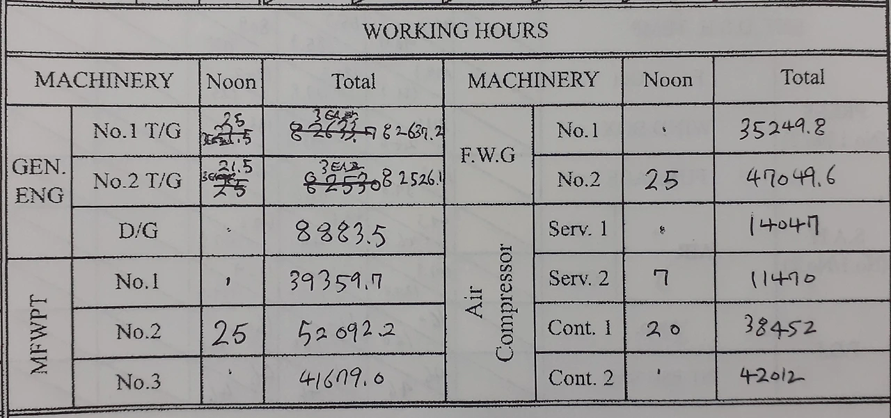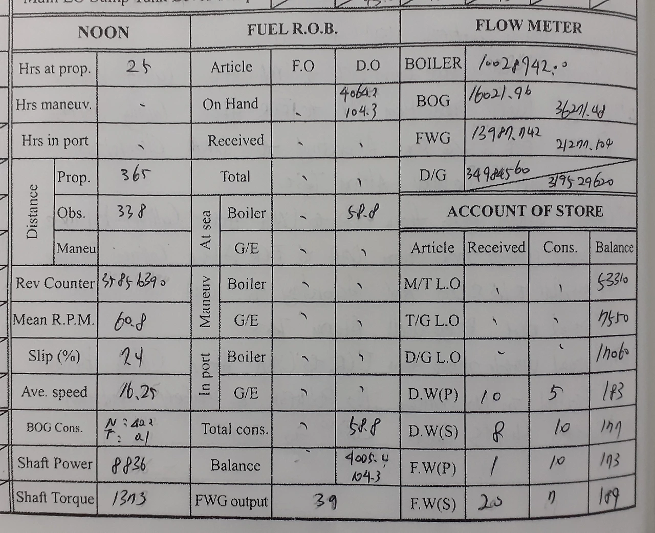 로그북은 정오 1200LT를 기준으로 작성하는 서류입니다. 자정 0000LT를 기준으로 하면 1일의 기준상 편리하겠지만, 그렇게 되면 여러분이 한밤중에 로그북을 작성해야 합니다. 그렇기에 편의상 1200LT를 기준으로 작성하게 된 것인데, 실무에서는 대개 1100LT 쯤 작성합니다. 점심시간 때문인데요, 그렇게 되면 1100LT에 보이는 모든 값들은 전날 NOON부터 지금 1100LT까지의 차이, 즉 23시간어치의 값일 겁니다. 이것들은 모두 ÷23 ×24를 해서 24시간 뒤 값으로 보정해서 작성해 줘야 합니다.