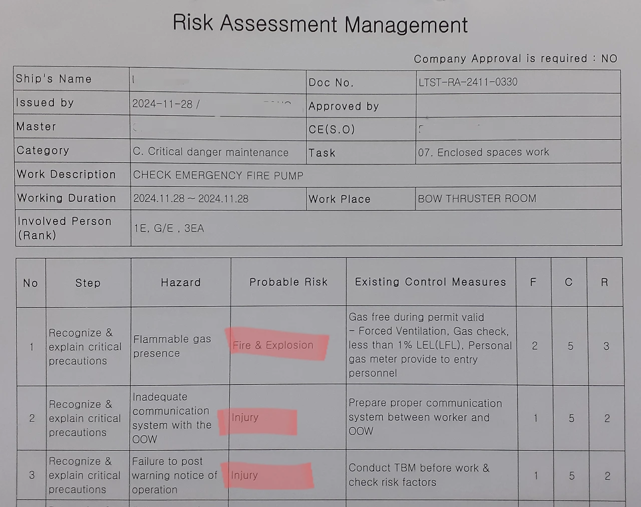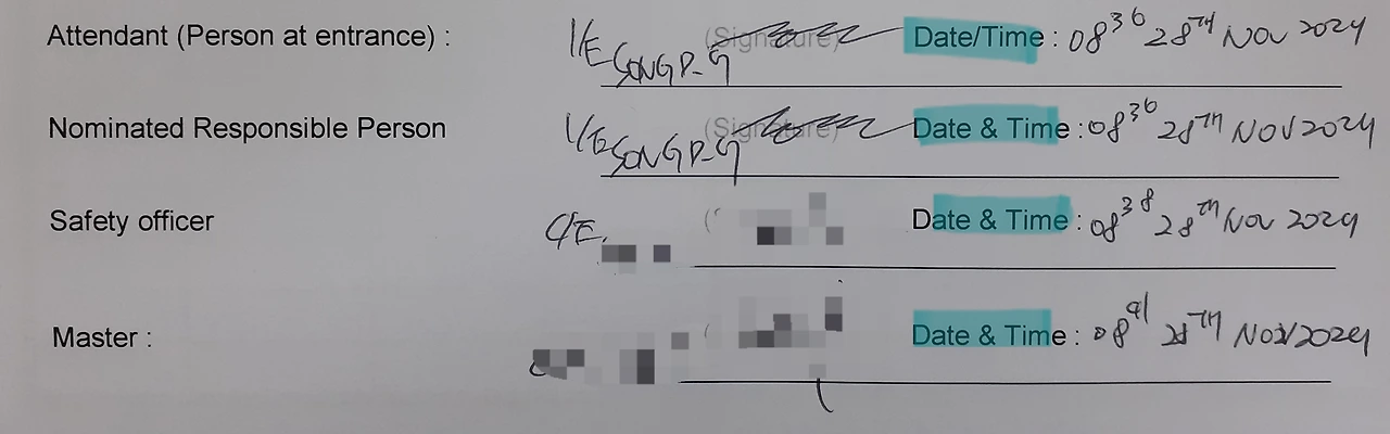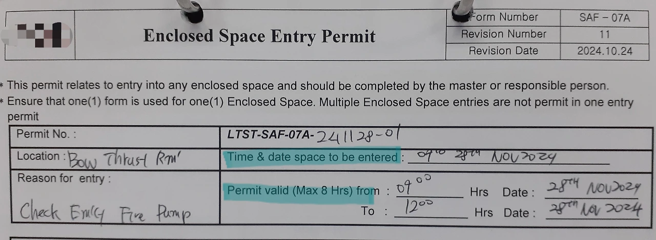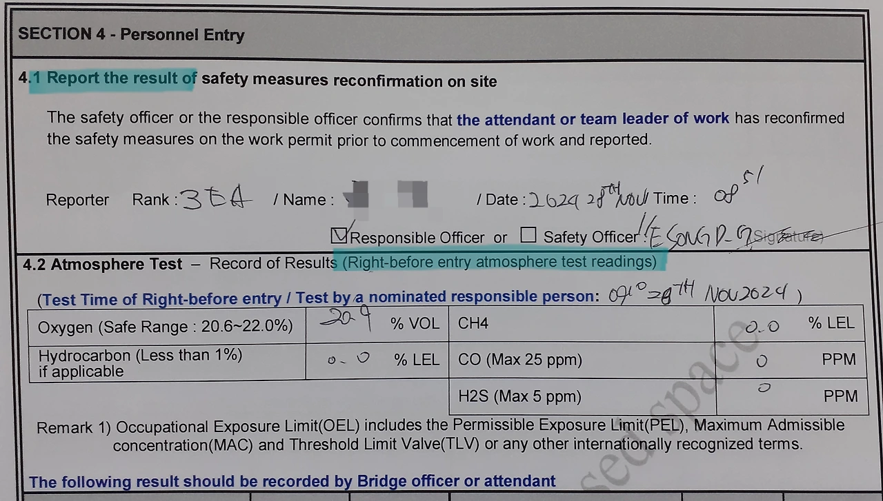 밀폐구역의 안전이 확보되었으면, 이 작업허가서에 대한 안전관리책임자의 서명이 기입됩니다. 이때 현장 책임자, 안전 책임자, 선장 순의 서명이 들어가게 됩니다.