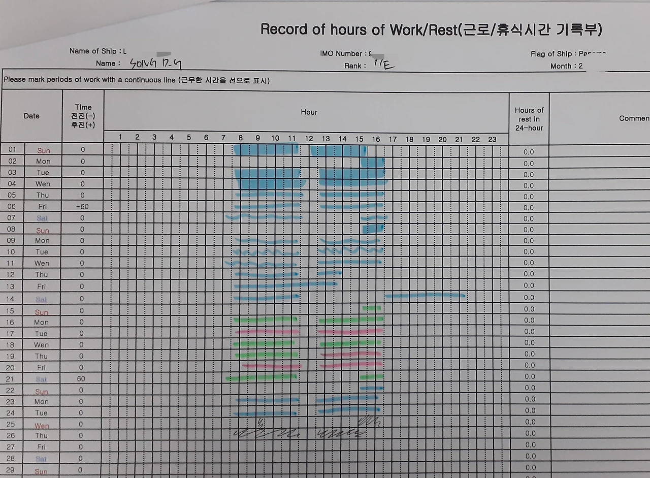 근로기록부, 이른바 워크 앤 레스트 서류는 선원의 근무시간과 휴식시간을 기록하는 서류입니다.