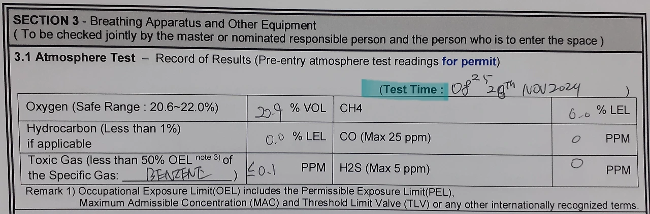 진입직전 마지막으로 가스테스트를 합니다. 해당사항을 작업책임자에게 보고하고 서명을 받으면, 이제 실제 진입이 시작됩니다.