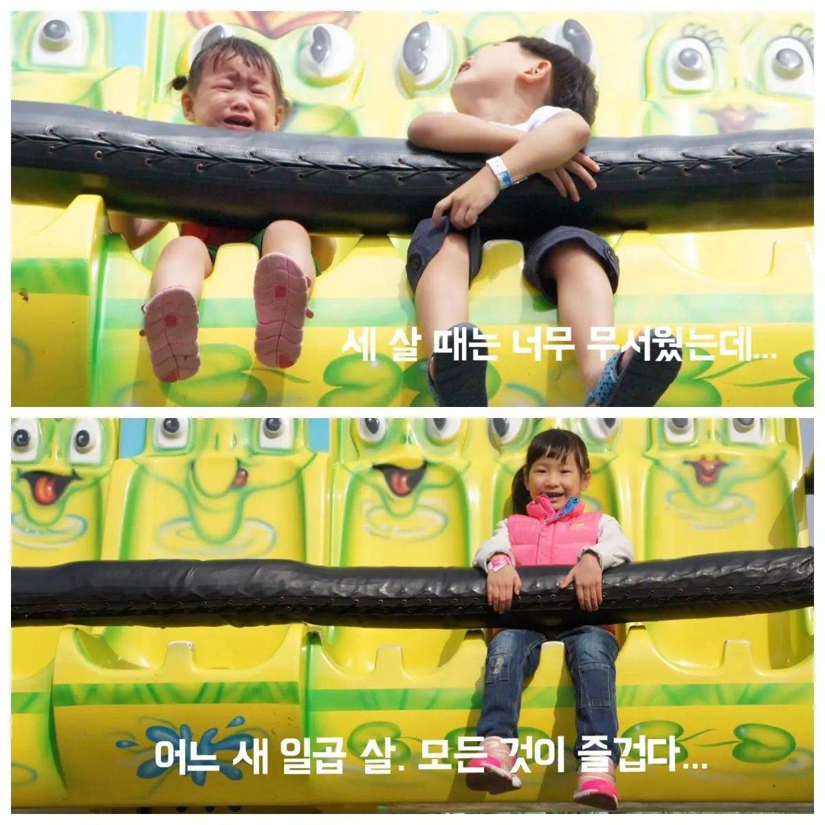 그리고 동생 속도 모르고 혼자 신나하던 아들은,이제 유아용 기구는 탈 수 없는 '어린이'가 되었다.