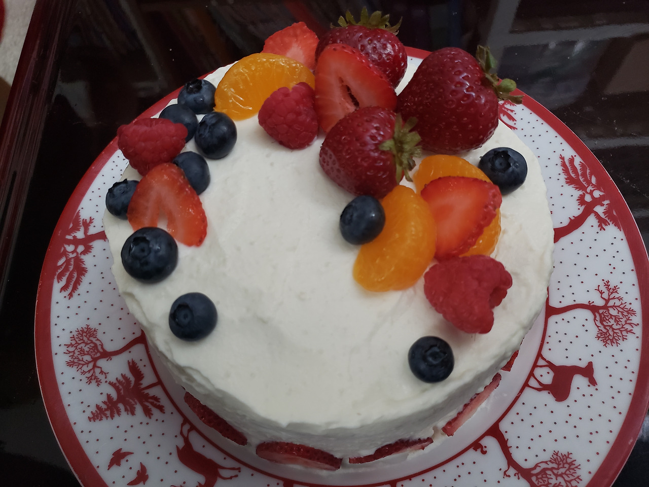 케이크를 구워 시트 사이마다 과일과 크림으로 채우고 생크림을 덮어 과일로 장식한 생크림 케이크