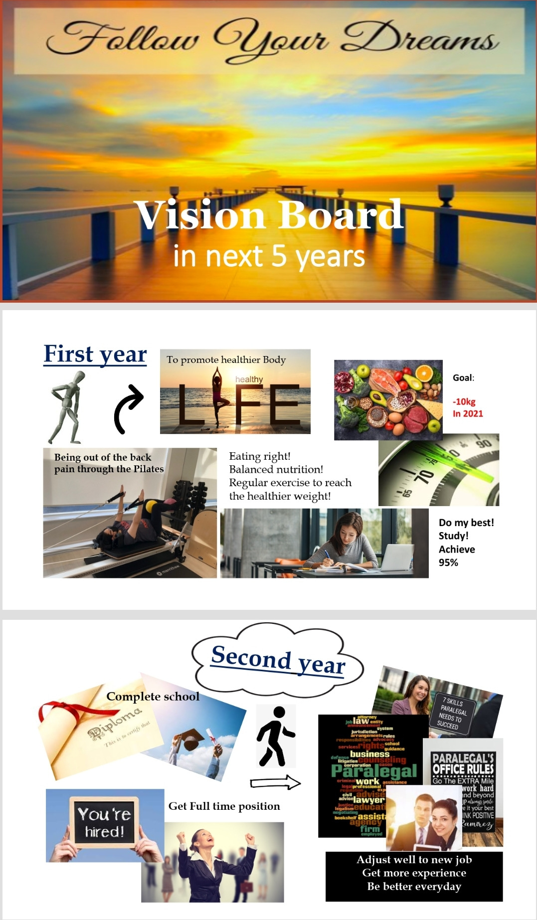 내가 만든 앞으로의 5년 나의 비전 보드이다. 선생님이 보시더니 꼭 프린터해서 책상 앞에 붙여놓으라 하셨다. 며칠 전부터 내가 원하고 바랬던 법에 대한 수업이 시작되었다. 정말 어려운 내용이라 이해하기 힘들 거라는 선생님의 암시(?)에 약간의 두려움이 다시 자라났다.