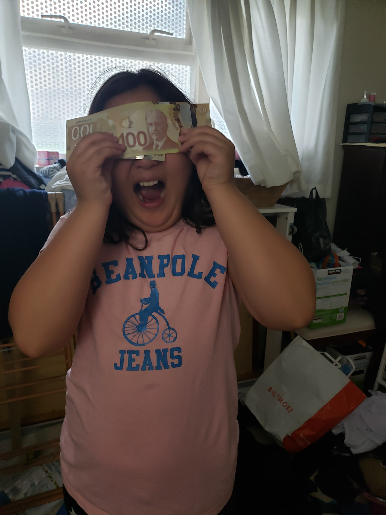 한국에서 조부모님이 주신 용돈에 입이 찢어졌다. 표정만 봐도 행복하다