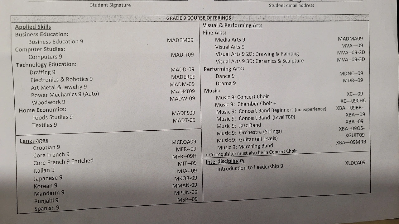 수강 신청이 가능한 과목들이 리스트로 적혀있다. 모든 과목들 옆에 숫자 9가 적혀 있는 것을 볼 수 있다. 9학년이 되는 학생들을 위한 과목들이다. 일 년에 총 8과목을 듣게 되는데, 필수로 들어야 하는 과목들과 선택 수업으로 나누어져 있어서, 선택 수업은 원하는 걸로 신청하면 수강이 가능하다.