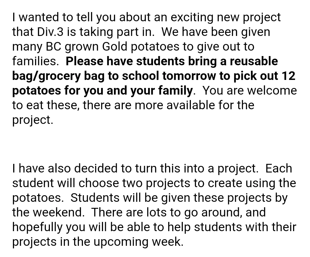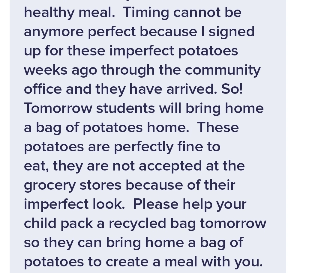 선생님이 보내주신 메시지 내용은 같았다. 가방을 따로 준비해서 학교에 보내라는... 감자를 배분해 주겠다고 한다. 먹을 수 있는 감자지만 모양이 이쁘지 않아서 마트에서는 팔 수 없는 상태의 감자들이 학교 커뮤니티 오피스를 통해서 들어왔다고 한다.