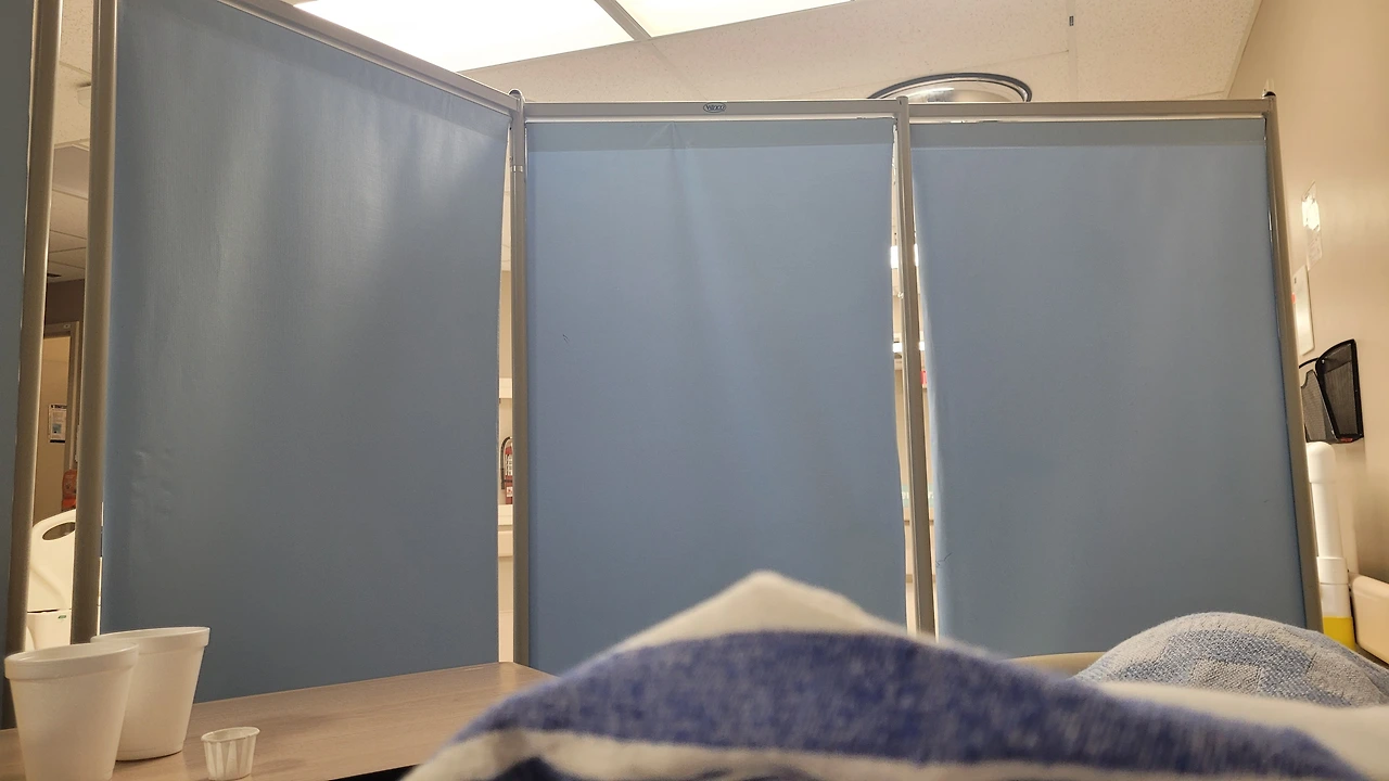 내 공간, 병실이 없어 복도에 설치한 환자 침대 주위로 가림막 두 개를 세워 만들어 준 나만의 공간에 앉아 물을 홀짝이며 갈증을 해소하는 찰나에 간호사가 왔다.