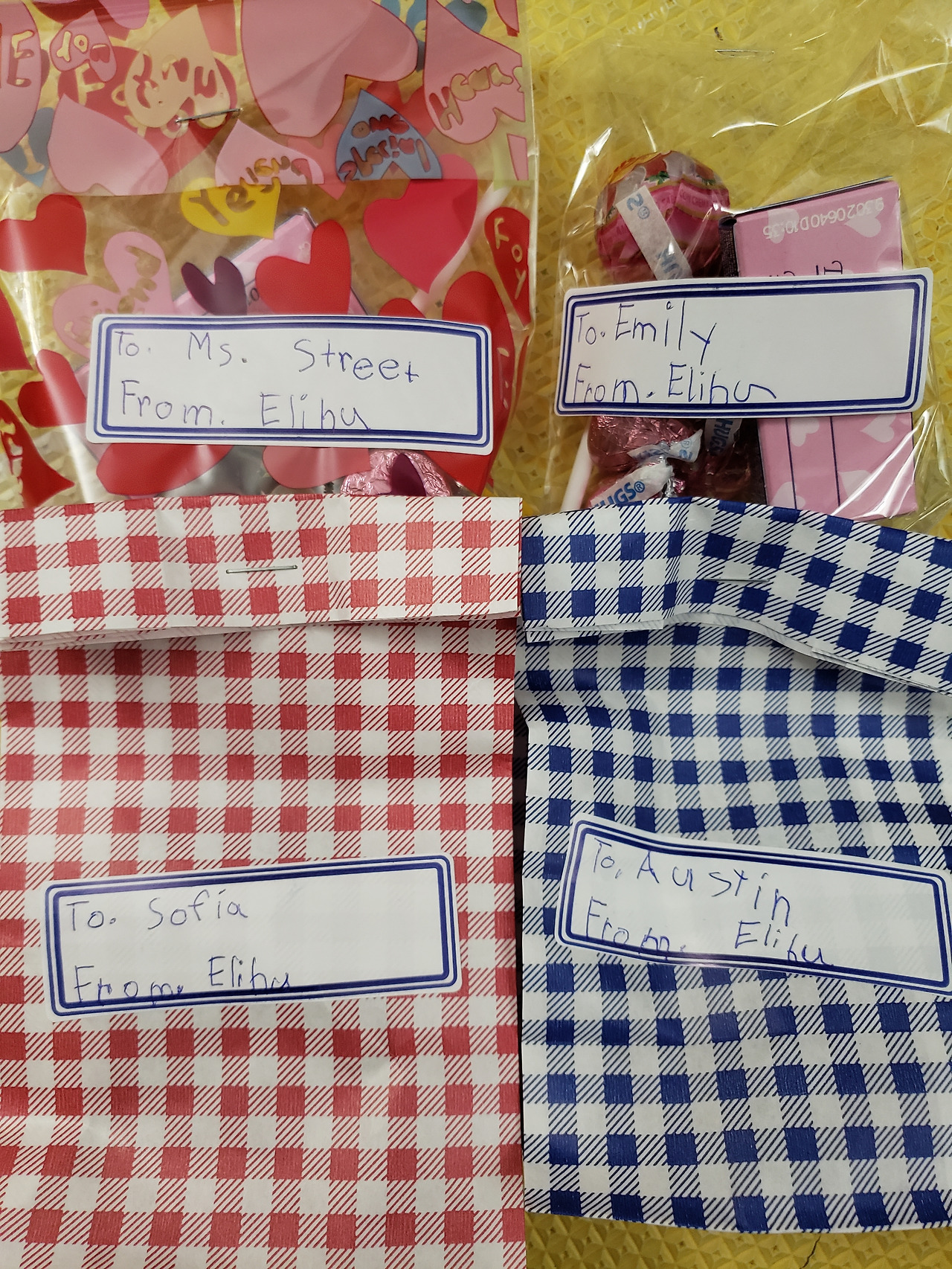 각 구디백에 받는 사람 이름과 주는 사람 이름을 써서 나눠준답니다.보통 발렌타인데이 카드와 함께 준비하는데, 이번에는 제 실수로 작년에 싸게 사놓은 카드를 찾지를 못해 그냥 이름 스티커에 이름을 써서 보냈습니다.