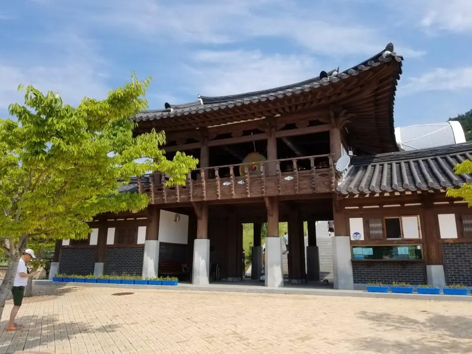 언덕 위에 놓인 체험관 건물의 크기는 오르막길에서 보아서 그런지 4층 이상의 높이로 보인다. 거대한 북같이 생긴 양쪽 둥그런 건물 사이에는 3층짜리 아리랑 체험관이 있다. 체험관 앞마당에서 앞을 내다보면 커다란 솟을대문 형식으로 만들어진 기와 입구가 보이고, 그 너머로는 멀리 산 사이에 바다까지 내다보인다.
