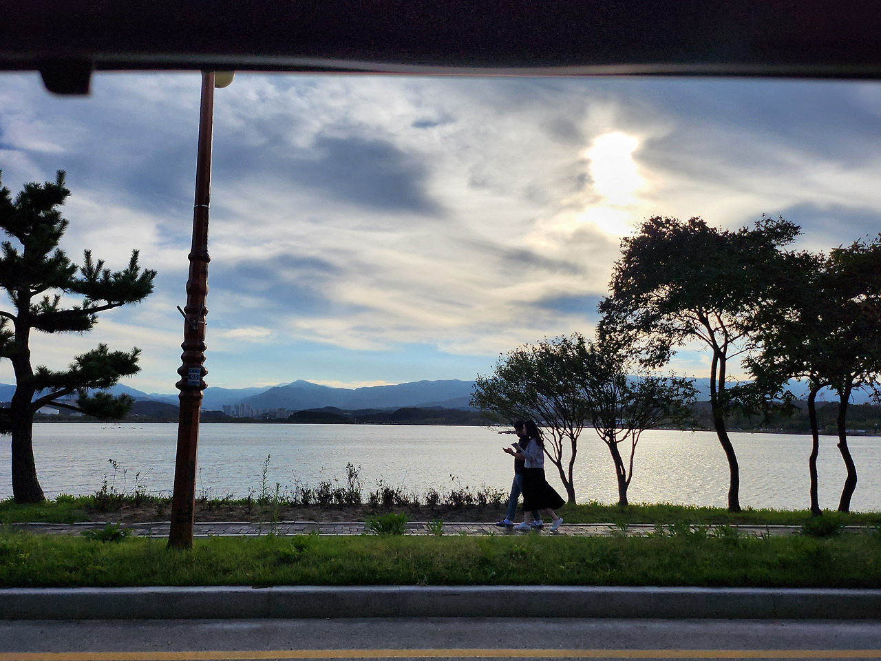 강릉에는 높은 빌딩이 보이지 않는다. 초당순두부 식당거리도 그렇고, 안목해변도 그렇고, 호수 주변도 그렇고, 멀리 보이는 약간의 아파트 건물 외에는 고층빌딩이 하나도 보이지 않았다. 우리가 강릉 중심가에 들어가지 않아서 그런 것인지, 아니면 강릉시에 원래 고층 건물이 없어서 그런 것인지는 알 수 없었다.