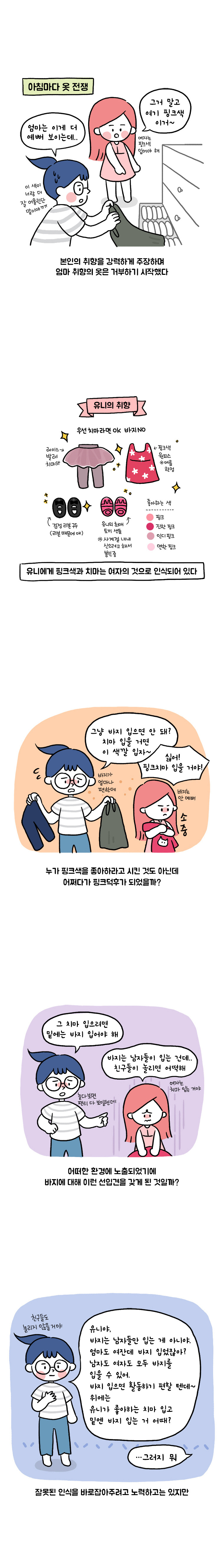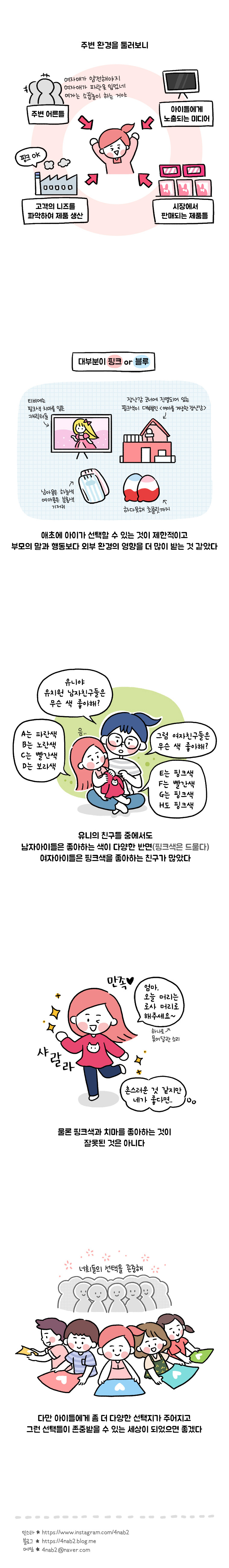 (아마 이런 생각들 때문에 시장에 핑크색 제품들이 쏟아져 나오는 거겠죠?ㅠ 악순환을 어디서부터 끊어내야하는지..그림에 나왔다시피 핑크색을 좋아하는 게 잘못은 아니지만 좀 더 다양한 색을 접했으면 하는 바람이에요)