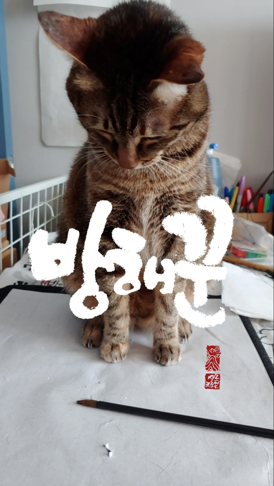 오늘도 오전에 급한 일을 보고 집에 돌아와 글씨를 쓰려 화선지를 폅니다. 그런데 집에서 혼자 잠만 자던 고양이 녀석이 오늘따라 칭얼대며 쫓아다닙니다. 혼자서 심심했던걸 투정하느라 그럴까요. 급기야 화선 지위에 올라와선 뒹굴뒹굴 뒤집다가는 화선지도 발톱으로 그어버립니다. 그러다 자기도 미안했던지 화선지 위에 올라앉아 가만히 자기가 저지른 짓을 바라봅니다. 그래도 밉지 않은 방해꾼입니다. 혼자 집에만 있게 한 것도 안쓰럽고 미안해 붓을 내려놓고 한바탕 놀아줍니다. 결국은 손등에 할퀸 상처 한 조각 남겨놓고 놀이는 끝났습니다.