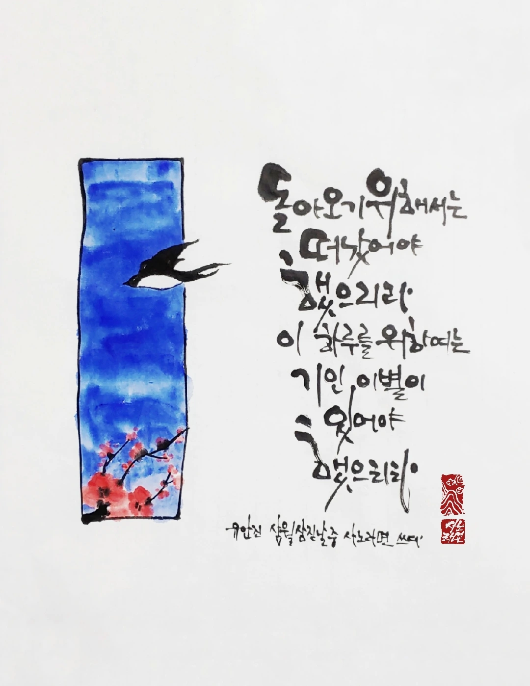 유안진 님의 '삼월 삼짇날'을 써보면서 '당당 멀다'라는 단어가 새롭습니다. 사전을 찾아보니 '당당'이란 단어는 ‘멀다’와 함께 쓰여, 목적지에 도착하기 위해서 아직 갈 길이 많이 남아 있음을 나타내는 말로 전남 지방의 방언이라 합니다. 참 재미있는 표현이네요