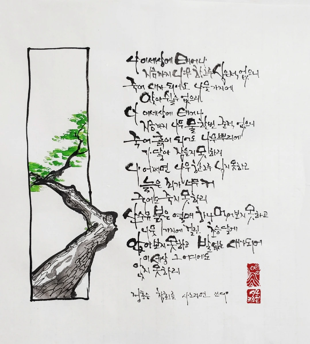 식목일이 오늘, 그 초록에 나무 한 그루 더 하진 못해도, 그 초록들의 건강함을 응원해 봅니다. 그 마음으로 정호승 님의 참회 한 구절을 그려봅니다. 태어나 나무 한 그루 심지 못하고, 태어나 나무에 물 한줄기 주지 못했으니 나 죽어 나무에도 쉬지 못하고 나무뿌리에 가 닿지 못할 거라 참회합니다. 산수유 하나 따 먹지 못할 발 없는 새가 되지 않을까 참회한다 합니다.