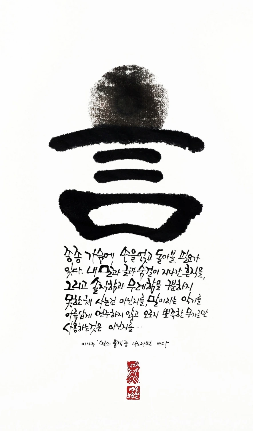 붓끝에 먹을 적시면서 나의 글 또한 다시 한번 돌아봅니다. 내 붓끝에는 치기 어린 꼰대 정신이 흠뻑 젖어있지는 않는지, 내 화선지에는 틀에 박힌 매너리즘이 한 꺼풀 입혀져 있지는 않는지, 내 시선은 세상의 먼지로 가득 덮인 두꺼운 안경알에 가려있진 않는지, 내 마음은 교만과 옹졸함으로 꼬여있지는 않는지, 내 말의 품격을 먼저 돌아봅니다 내 글의 품격을 먼저 돌아봅니다 꿀꺽, 뱉을 말 한번 삼켜보는 오늘입니다. 멈칫, 쓰고 싶은 글 한 획 접어보는 오늘입니다.