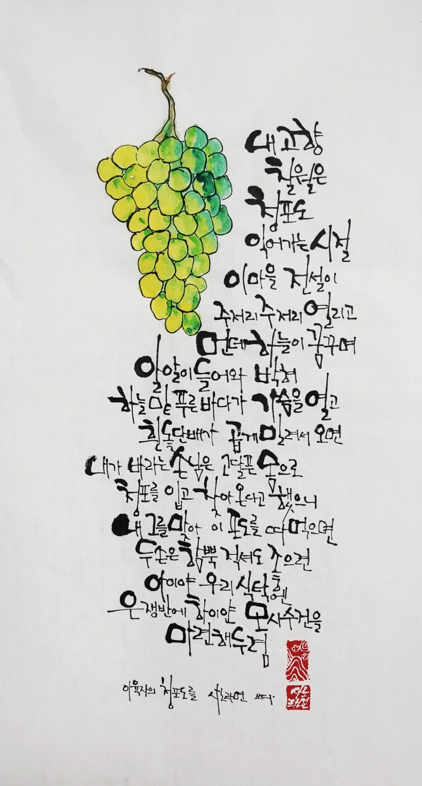 나도 모르게 하이얀 모시 수건을 깔듯 화선지를 펼치고, 청포를 입고 찾아오는 손님을 그리듯 붓은 청포도 알을 그리고 있습니다.