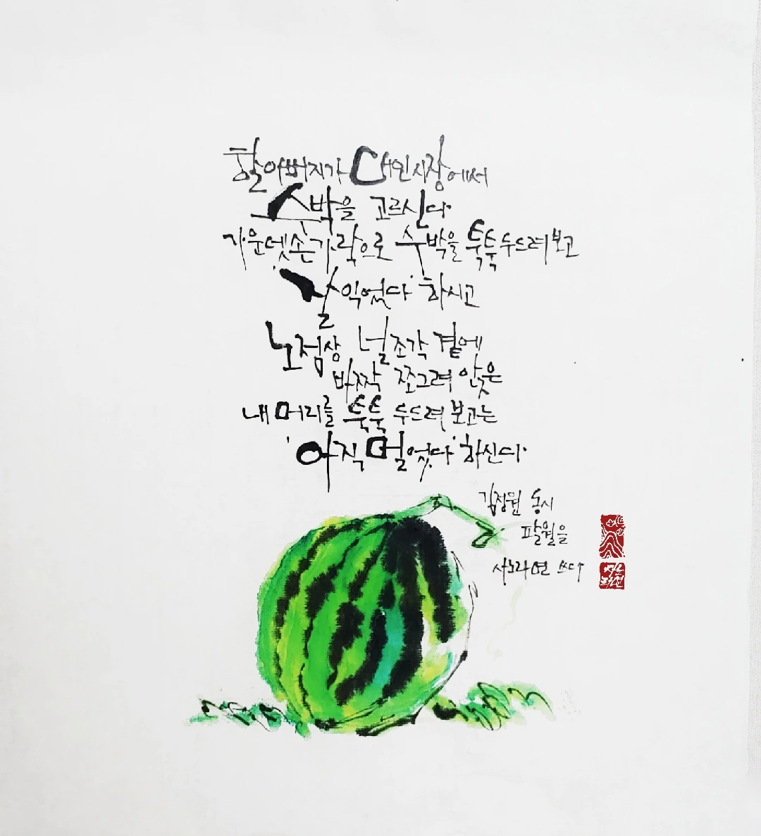 붓을 들어 수박 한 통 올려놓고는,