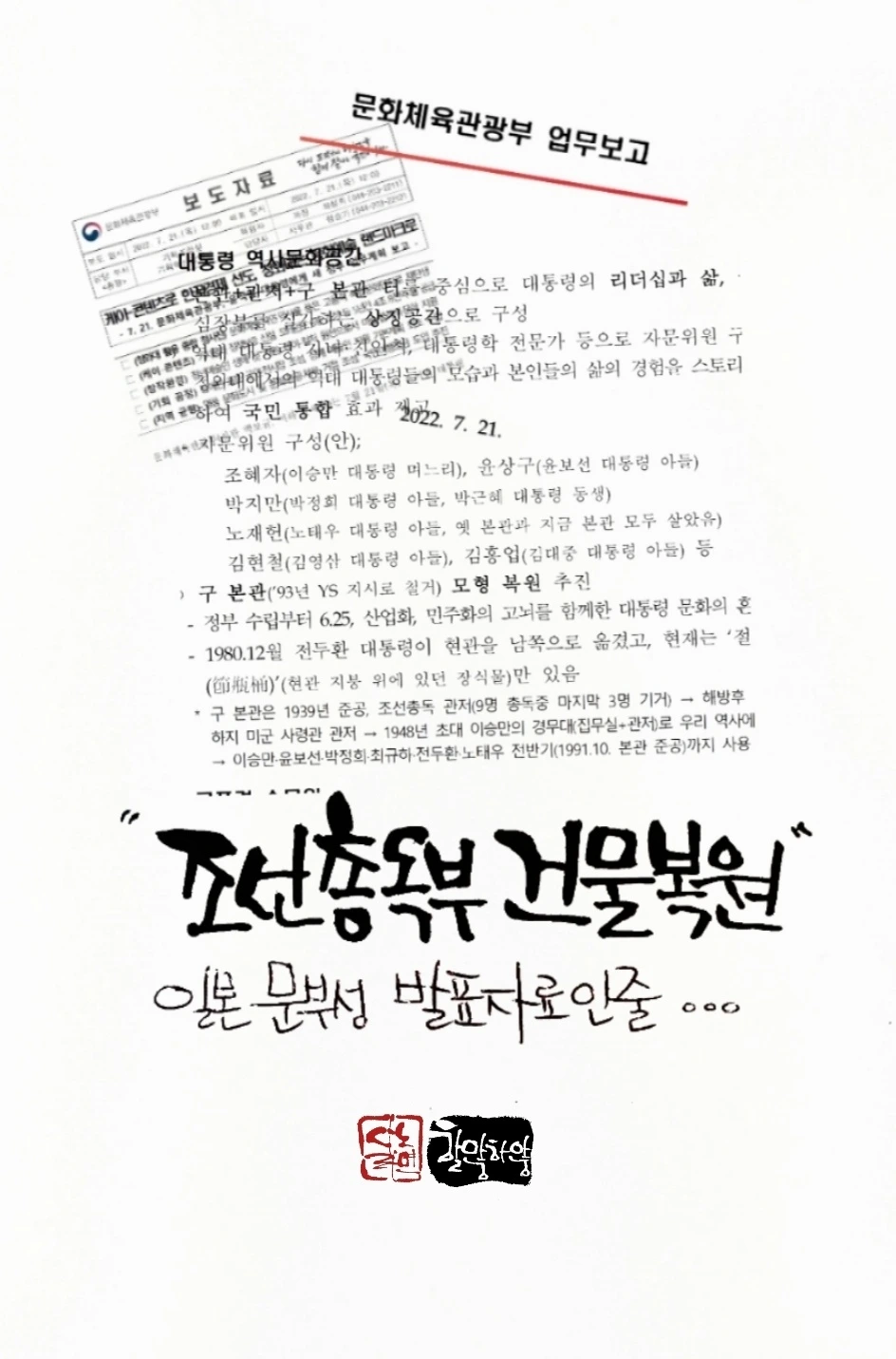 2022년 7월21일, 문화체육관광부에서 발표한 계획에 의하면 청와대 자리에 조선총독부 건물을 복원하겠다 한다.