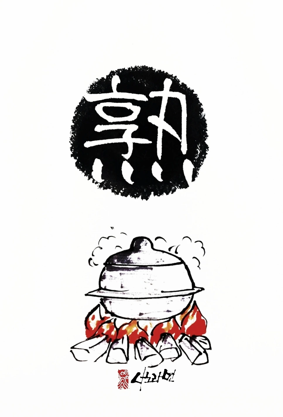 글자를 가만히 보면 솥을 올리고 불을 붙이는 팽烹자 옆에 사람이 서서 기다리는 형상입니다. 끓는 솥을 지켜보며 익어 감을 기다리는 것이죠.