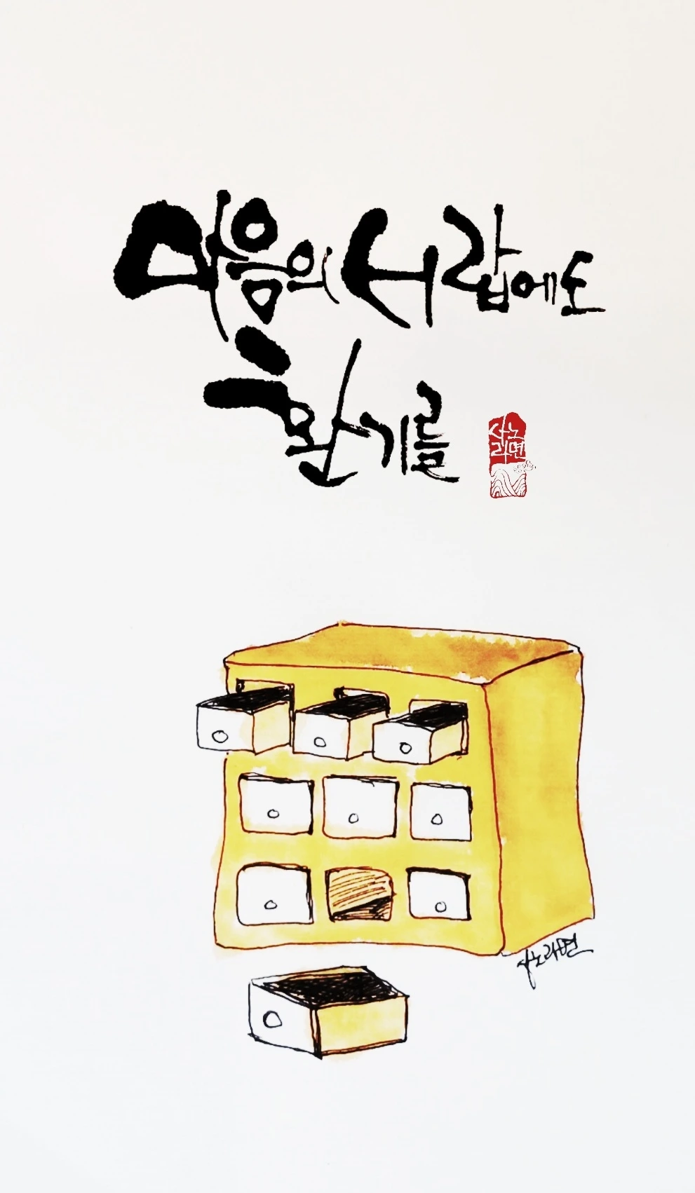 한약방 약장만큼이나 많은 서랍들이 내 마음엔 있습니다. 내 일생을 함께 한 오래 묵은 마음들도 있고, 요즘 들어온 새 마음도 있습니다. 내 마음의 서랍에도 그런 다양한 마음들이 담겨 수시로 열리고 닫힙니다.