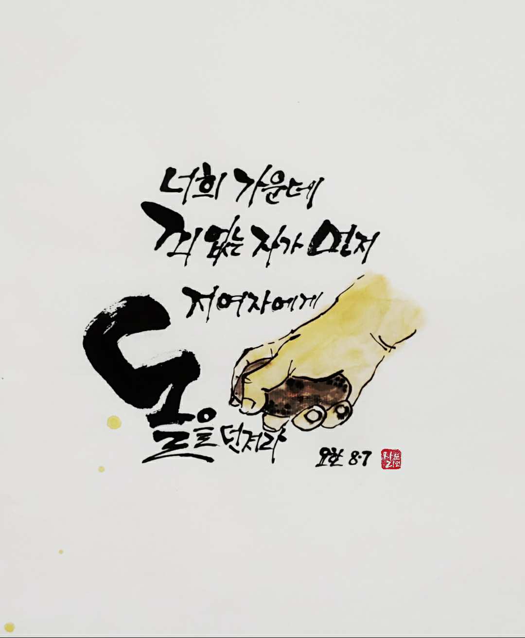 오늘의 말씀은 성경에 기록 된 사건 중 하나로 아마 비 신자들에게도 많이 알려진 이야기가 아닐까 싶습니다. 죄인이라 생각하고 저마다 돌을 쥐고 단죄하려는 군중들의 모습과, 그들에게 ' 너희 가운데 죄없는 자가 먼저 저 여자에게 돌을 던지라 ' 하신 예수님의 말씀을 들으며, 오늘을 살고 있는 우리들의 손을 보며 묵상해 봅니다.