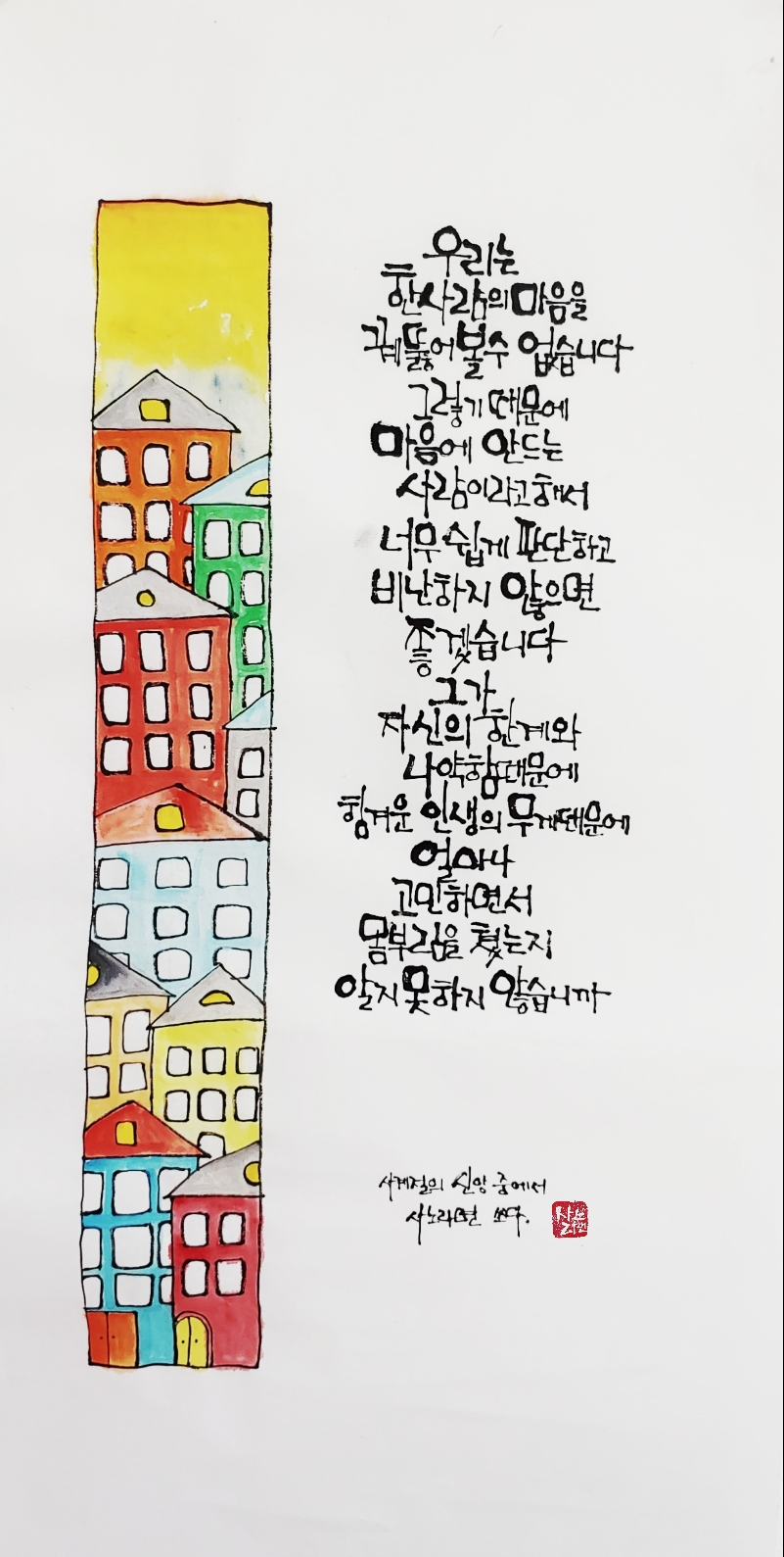 '우리는 한 사람의 마음을 꿰뚤어 볼 수는 없습니다. 그렇기 때문에 마음에 안드는 사람이라고 해서, 너무 쉽게 판단하고 비난하지 않으면 좋겠습니다. 그가 자신의 한계와 나약함때문에 , 인생의 무게때문에 얼마나 고민하면서 몸부림을 쳤는지 알지 못하지 않습니까..'