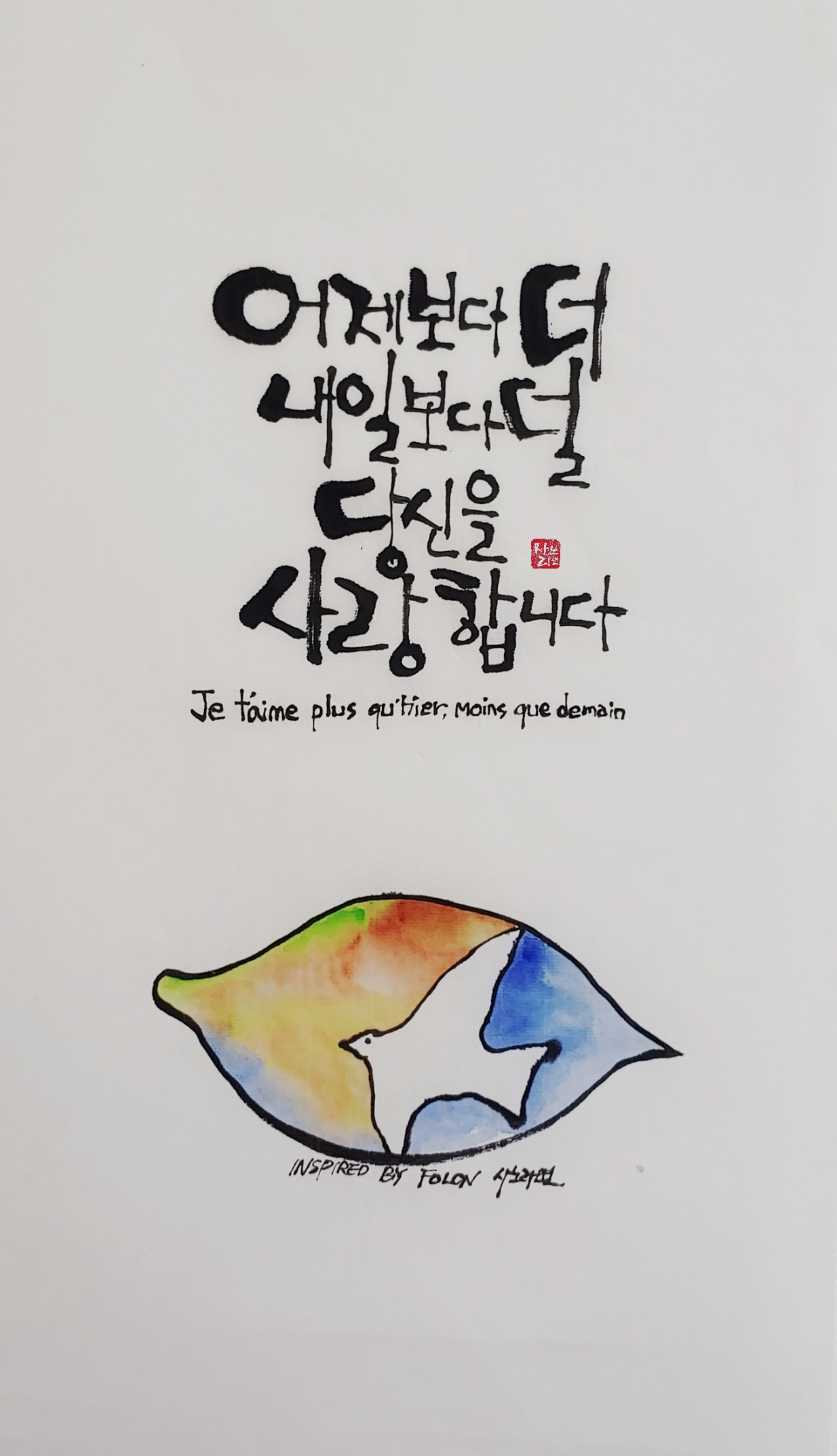 어제보다 더, 내일보다 덜 당신을 사랑합니다 Je t'aime plus qu'hier mais moins que demain.