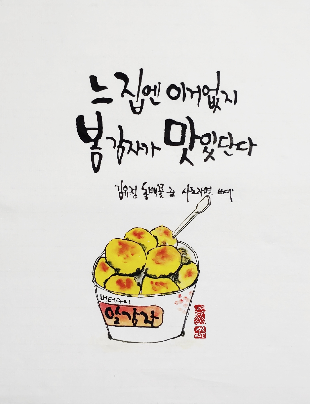#감자 는 그렇게 어린시절엔 구황작물이라 할 정도로 끼니 대용이거나 좋은 간식거리였죠. 삶아서 으깨어 설탕뿌려 먹던 맛고 생각나고요, 밥 속에 박혀있던 감자 조각도 기억나고요, 그냥 아궁이에 구워먹던 새까맣게 탄 감자도 빠질수 없고요. 그렇게 뜬금없는 추억의 감자 생각에 김유정의 소설 '동백꽃'의 한 구절 그려봅니다. '느 집엔 이거 없지? 봄 감자가 맛있단다..'