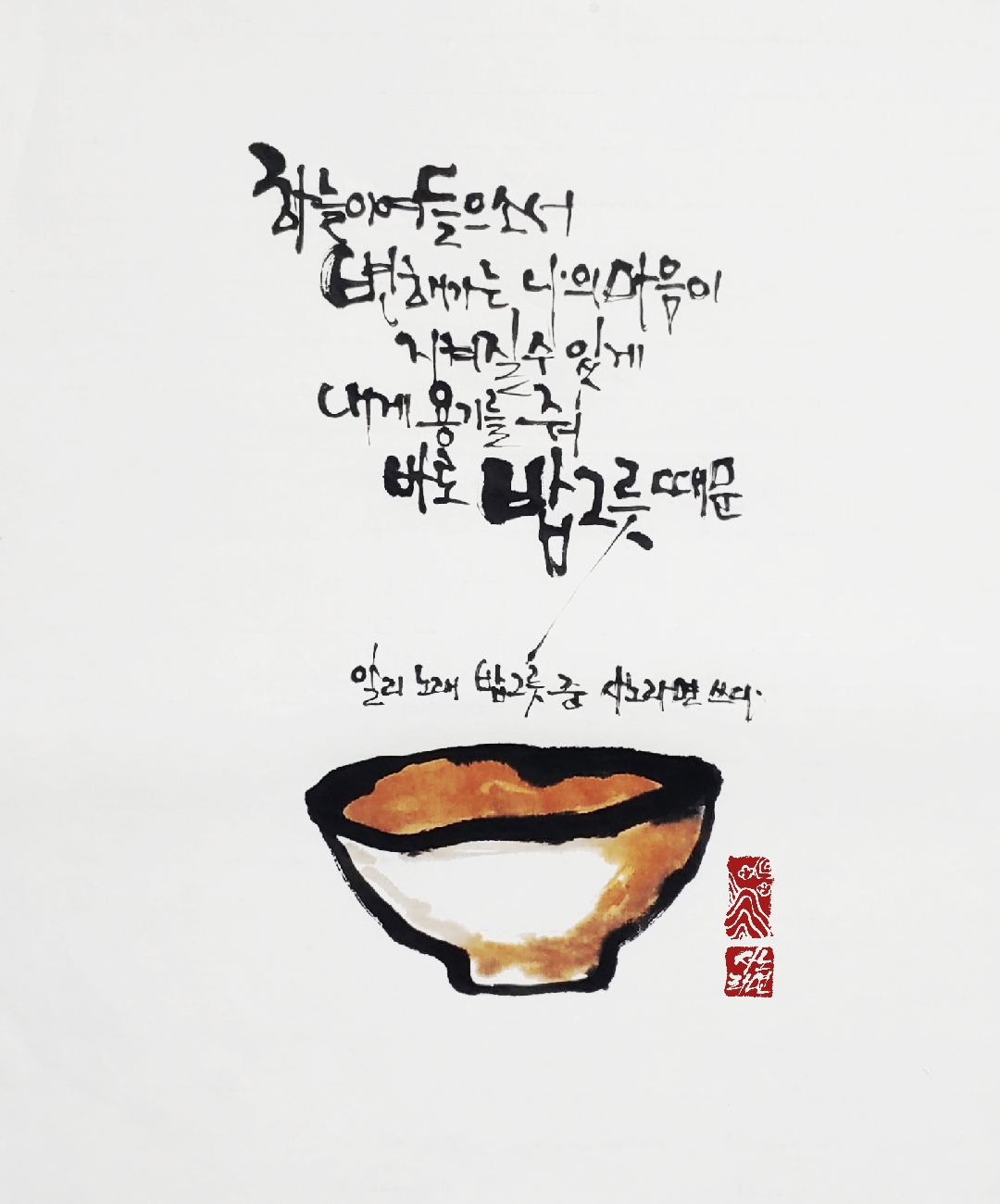 참아 내는 게 미덕이라 생각했어 그렇게 인생사는 방법이라 배웠어 그게 나를 사랑하는 유일한 길이라며 내 자신을 믿었지 동방예의지국이란 나라 안에서 어른을 공경하는 건 당연하다며 그런 생각은 옛말이란 친구의 말에도 내 자신을 믿었지 하지만 냉혹한 세상 속에서 점점 변해가는 나를 보며 느낄 수 있는 건 바로 내 밥그릇 때문 내 못난 술버릇 때문 바로 내 밥그릇 때문 현실은 어쩔 수 없더군 바로 내 밥그릇 때문 내 못난 술버릇 때문 바로 내 밥그릇 때문 현실은 어쩔 수 없더군