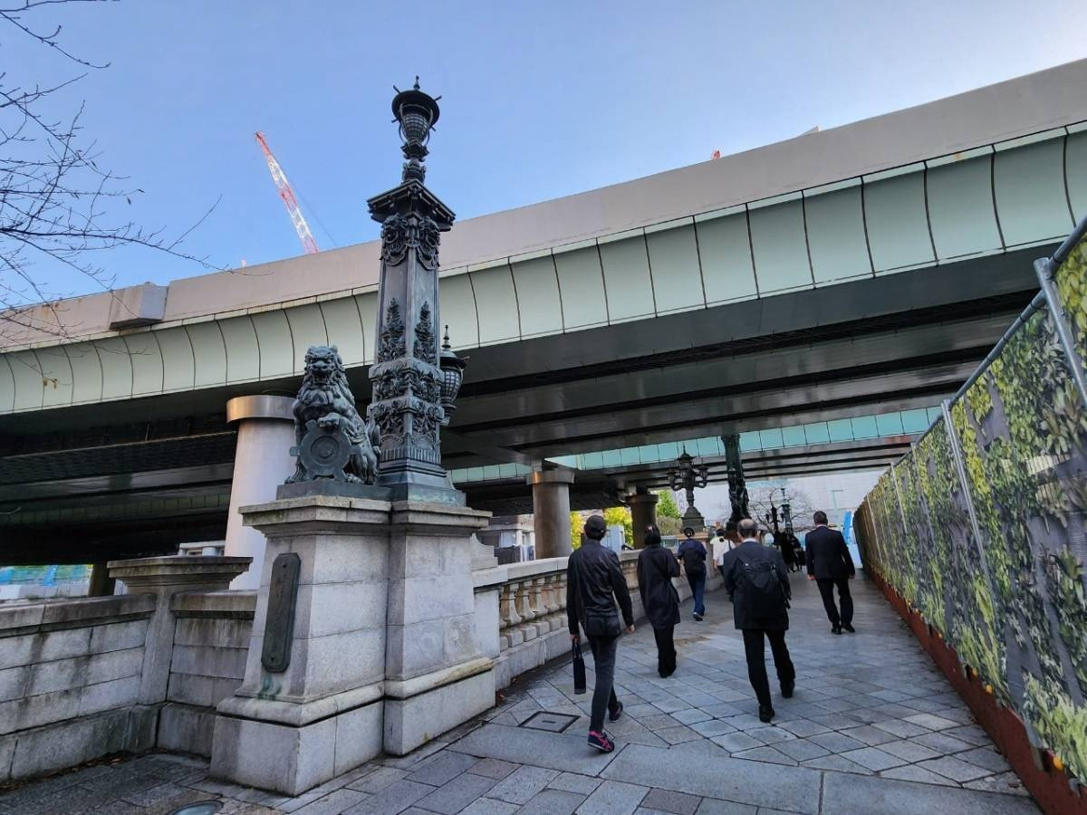 지금의 니혼바시는 1911년 르네상스양식의 석조교石造僑로 지어졌는데 메이지시대에 지어진 석조 교량으로는 드물게 현존하고 있습니다. 49.5미터의 길지 않은 교량이지만 도쿄의 최중심에 있는 100년 넘는 긴 역사를 지닌 유서깊은 다리입니다. 다만 1964년 도쿄 올림픽을 앞두고 도시의 원활한 통행을 위해 건설한 고가형 도로인 수도 고속도로 토신 칸죠선首都高速道路都心環狀線이 니혼바시 바로 위에 건설되어 다리를 가리고 있는 점은 흠이라 할 수 있습니다. 하지만 고풍스러운 가로등과 기린동상과 사자상이 운치를 더합니다. 다리에 씌여 있는 니혼바시 글씨는 에도막부의 마지막 쇼군 도쿠가와 요시노부徳川慶喜가 썼다고 합니다. 일본의 중요 문화재로 등록되어 있습니다.