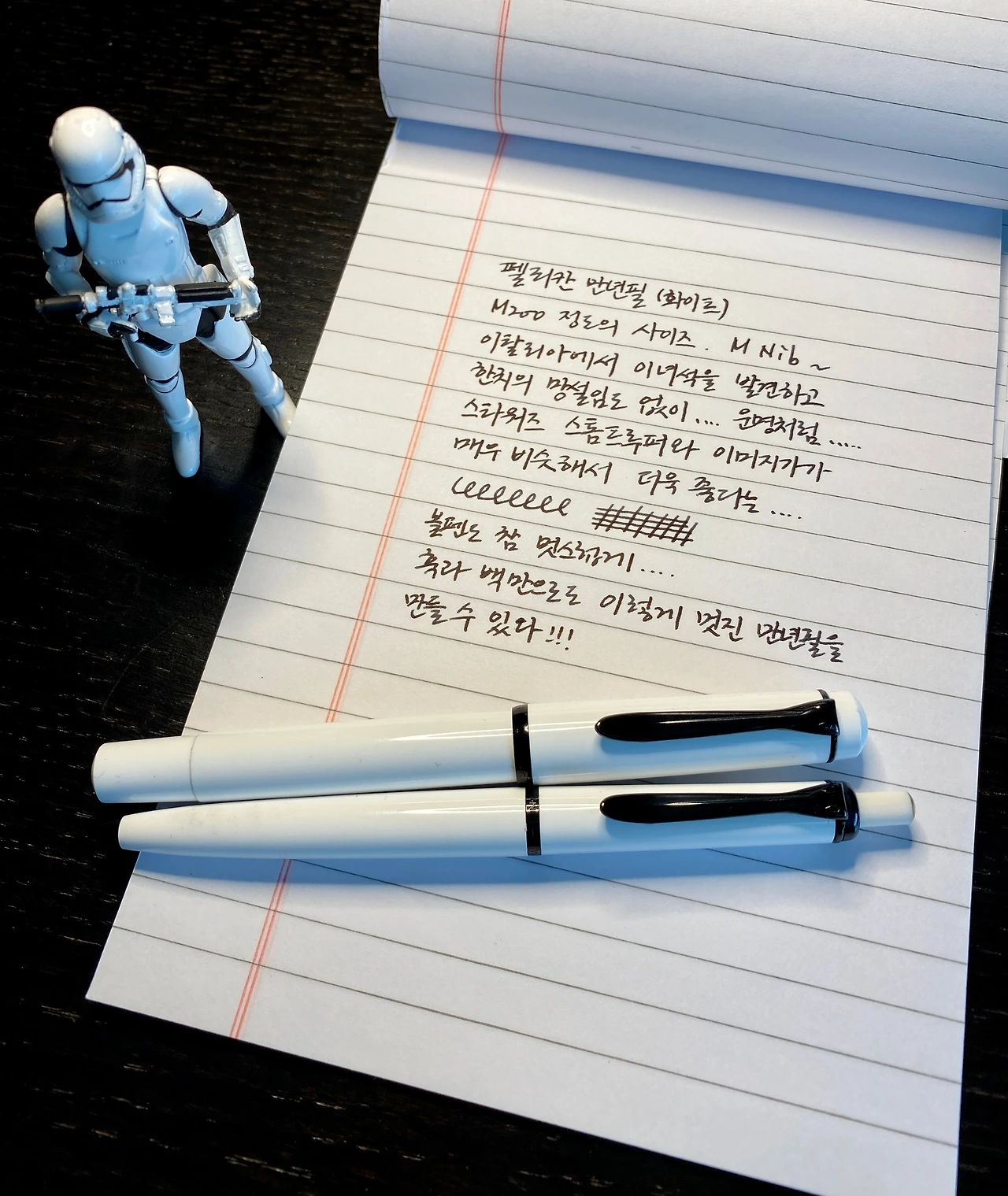 펠리칸 M100 스톰트루퍼 화이트 만년필(Pleikan M100 'The stormtrooper' Withe Fountainpen)이라고 검색이 많이 된다. 스타워즈 스톰트루퍼의 느낌과 이미지가 딱 있다.