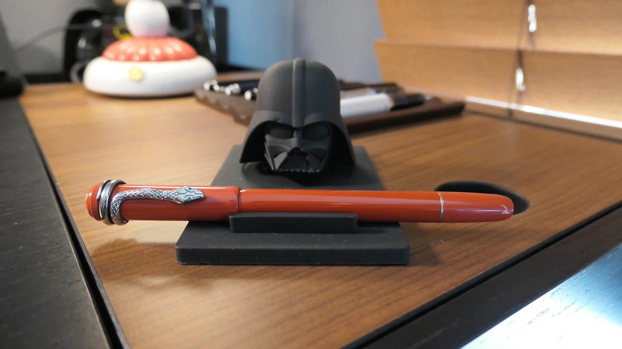 원래의 용도와는 전혀 다르게 펜레스트로 사용되는 것도 있다. 다이소에서 다스베이더 핸드폰 거치대를 샀는데 핸드폰보다는 펜레스트로 쓰는 것이 더 좋았다. 핸드폰은 거치하면 다스베이더가 보이지도 않고... 워낙 다스베이더가 강력한 캐릭터이니 아무 만년필이나 어울리지가 않는다. 다스베이더 캐릭터에 맞설 강력한 몽블랑 루즈앤느와가 딱 어울린다.