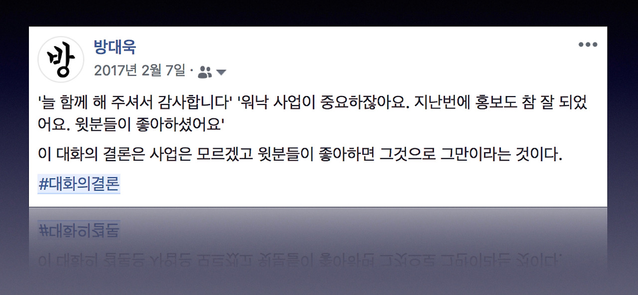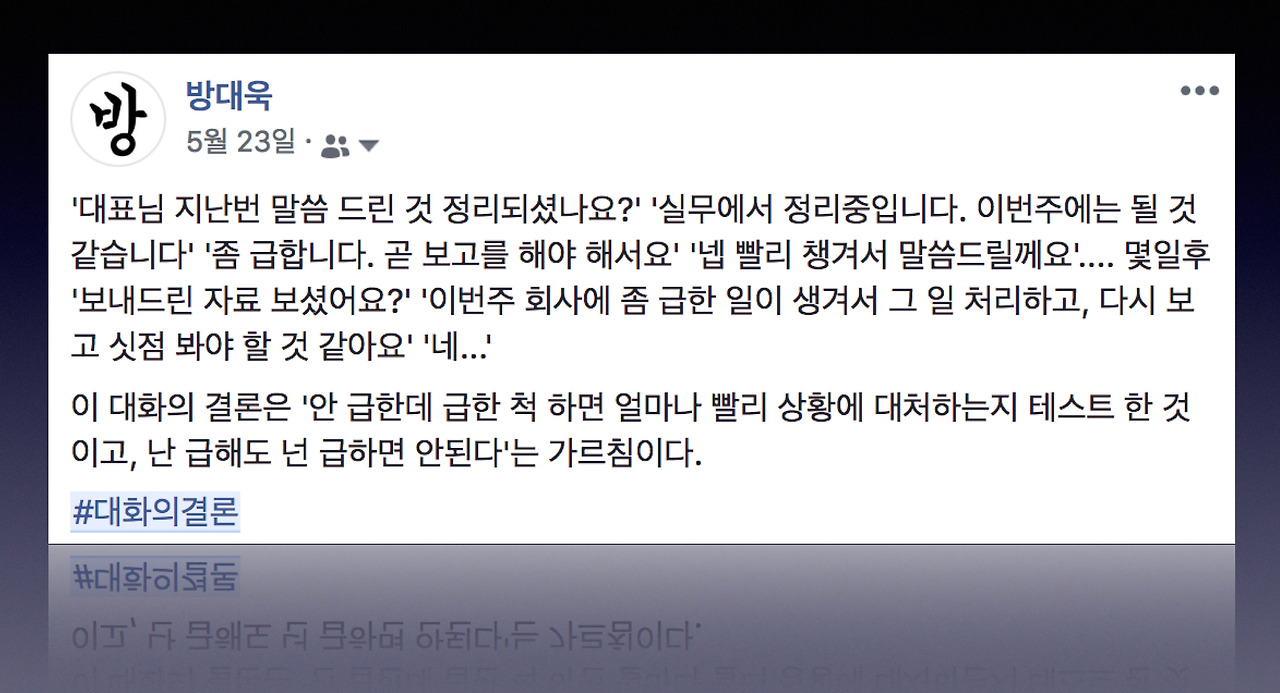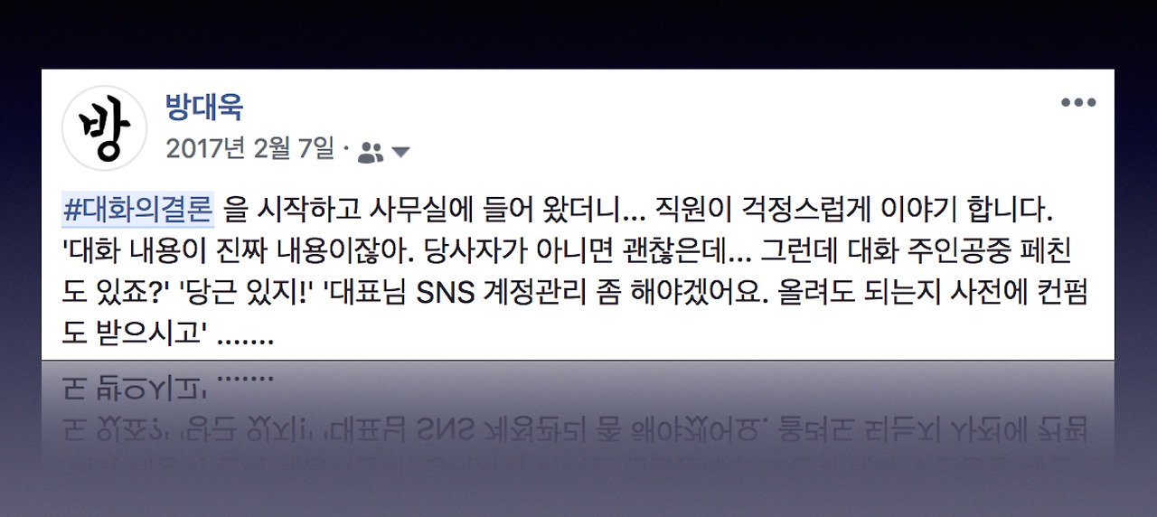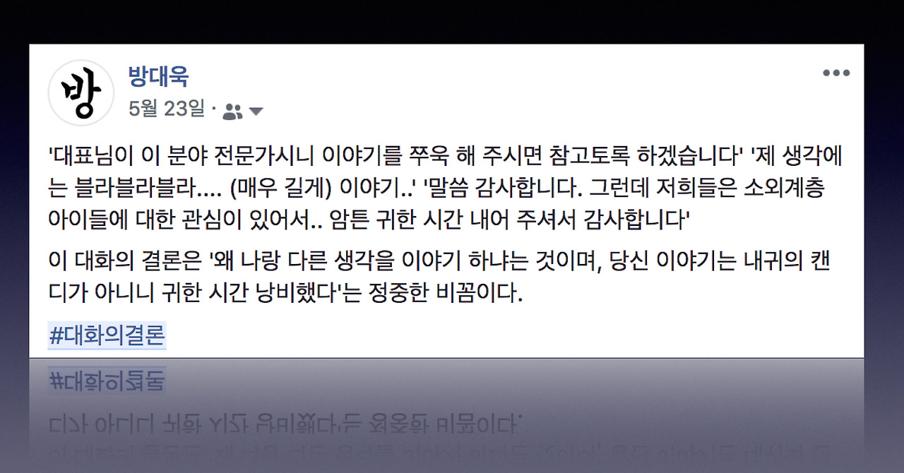 2017년 어느 날 제 페이스북에 '대화의 결론'이라는 해시태그를 달고 제법 많은 글을 올렸습니다. 사실 위의 7개보다 훨씬 많습니다. 사실 정확히 무엇을 말하고 싶고, 무엇을 변화시키고 싶어서 쓴 것인지 잘 모르겠습니다. 그냥 좀 답답했던 것 같습니다. 그래도 저는 제법 이 분야에서 밥을 얻어먹은 지 오래되어서 나름 경험과 네트워크를 가지고 있는데도 뭔가 꽉 막힌 대화를 이어가고 있는데.... 그렇지 않은 분들은 오죽할까 하는 생각도 들었던 것 같습니다.