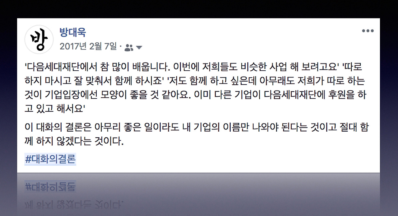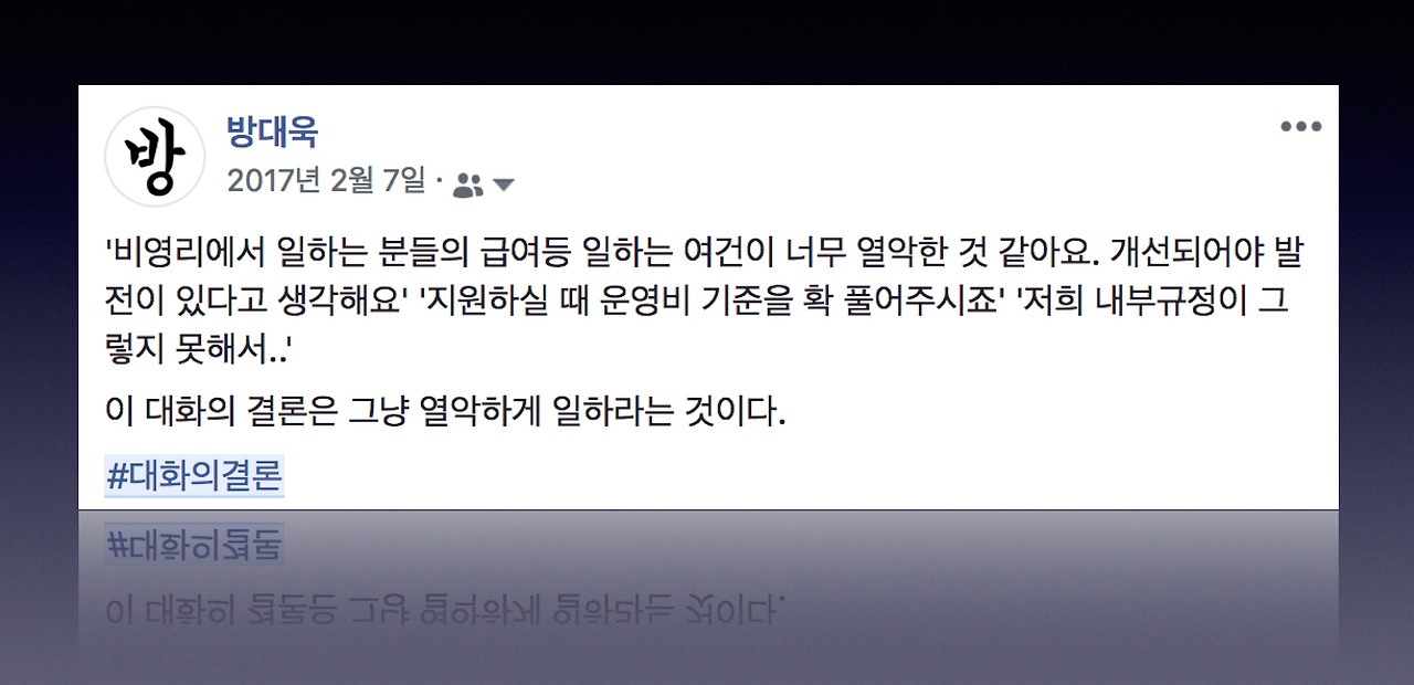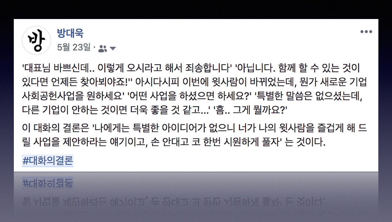 페이스북에서 #대화의결론 을 한번 검색해 보시길... 공감하시는지 아니면 제가 오버센스 하고 있는 것인지... 비영리와 기업의 멋진 대화를 기대합니다~