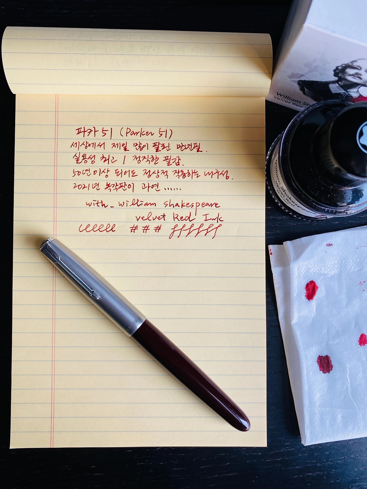 오래간만에 잉크를 주입했다. 다행히 아무런 이상 없이 잘 써진다. 파카 51은 실용성을 바탕으로 엄청난 인기를 누린 존재감 가득한 만년필이다. 이번에 새롭게 복각된 파카 51을 내 손을 넣을지 말지 아직 결론을 내지 못했지만 -아마 호기심 때문이라도 구하게 될 것 같은-, 복각된다는 자체가 그만큼의 존재감을 보여 주는 것이다. 존재함이 감사한 만년필이 바로 파카 51이다.