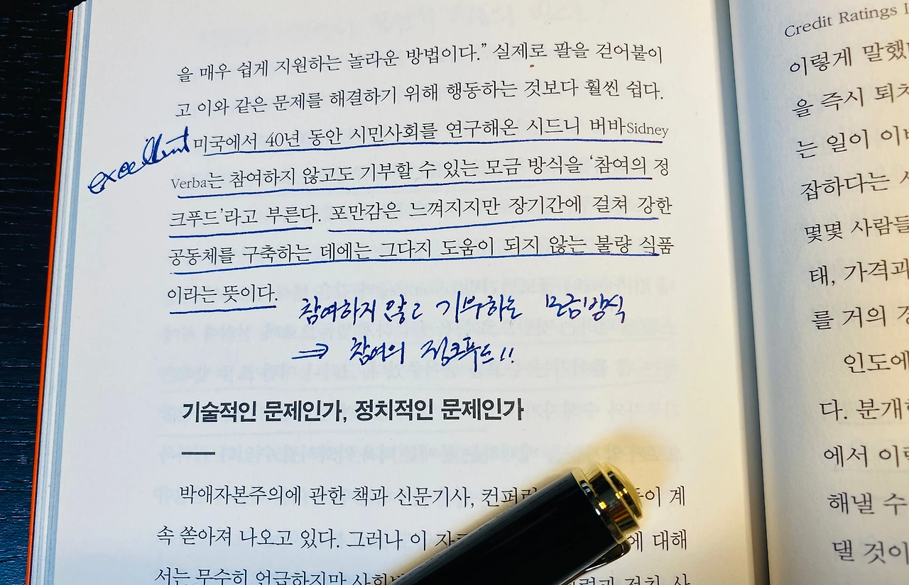 정말 할 말이 많은 책이다. 2013년도 읽을 무렵에는 의미 있게는 읽었지만 현실감이 그렇게 높지 않았다. '자본주의 대전환'이라는 책을 읽으면서 다시 꺼내 보니, 진짜 현실감이 쩐다! 요즘 어딜 가나 사회변화와 사회문제 해결을 이야기하는 무대에는 기업이 앉아 있다. 그리고 그 옆에는 기업을 사랑하는 -물론 비판의 제스처도 가끔 보여주면서 - 교수들을 비롯한 전문가들이 앉아 있다. 임팩트 투자자들도 물론 한 자리를 차지하고 있다. 비영리 부문의 사람들은 무대를 바라보고 있다. 무대가 끝나면 기업과 교수들, 임팩트 투자자 손이라도 한번 잡아 볼 심산으로.