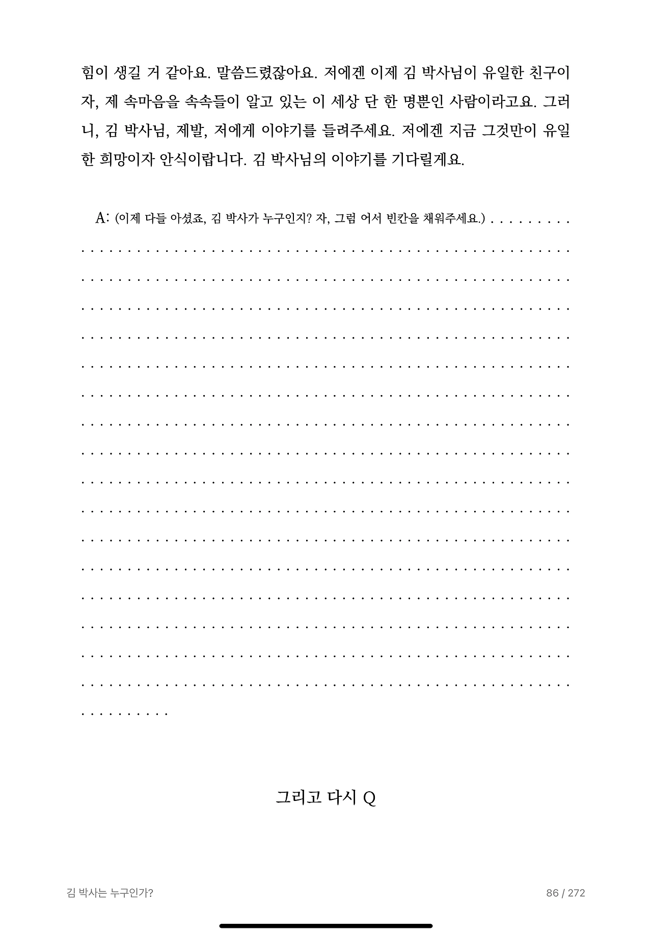 '사람들은 저마다 이야기 속에 한 가지씩 여백을 두고, 그 여백을 채우려 다른 이야기들을 만들어 내는 법인데, 그게 이 세상 모든 이야기들이 태어나는 자리인데, 그때의 나는 그것을 미처 알지 못하고 있었던 것이다' 라는 소설의 한 대목처럼 이 단편 소설집은 여백이 풍부했다. 힘빼고 여유있게 읽을 수 있었다. 단편인데 긴호흡이 가능했다. 심지어 소설가는 아예 독자들에게 채울 수 있는 여백을 물리적으로 제공하기까지 했다.