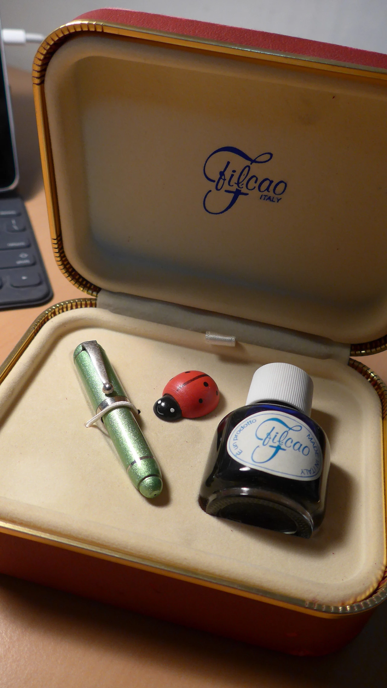 패키지 상태를 보고 안 살 수가 없었습니다. 앙증맞은 만년필, 앙증맞은 잉크, 풍뎅이는 왜 있는지... 실사용할 수 없어도 하나 꼭 가지고 싶다는 생각이 들었습니다. 볼로냐 펜샵 할아버지는 웃으면서 잉크를 넣을 수 있고 사용할 수 있다고 시현해 줬는데, 그 순간 바로 제 지갑이 열리고 말았습니다. 흥정할 정신도 없이 거의 부르는 가격을 다 드린 것 같습니다. 위의 사진으로 보면 얼마나 앙증맞은 지 감이 잘 안 오실 것 같습니다. 크기를 현실감 있게 보여드리겠습니다.