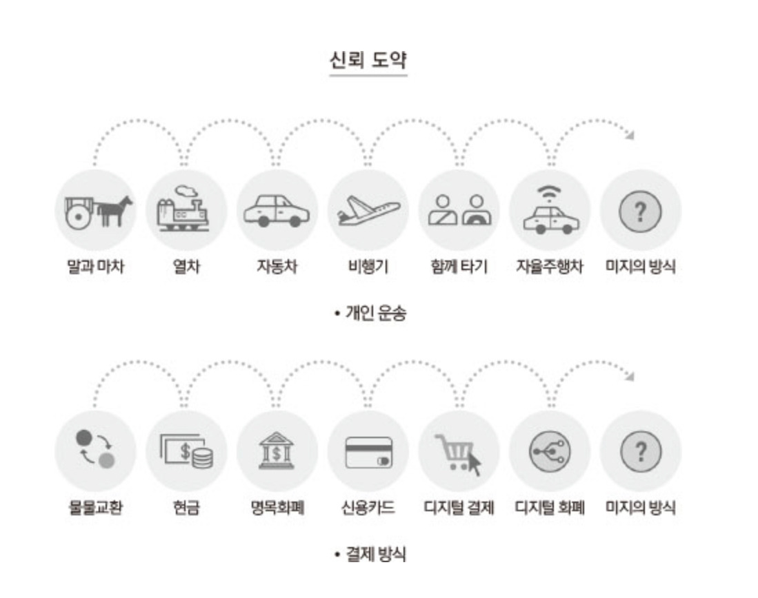 저자는 신뢰란 아는 것과 모르는 것을 연결해 주는 다리라고 정의했다. 새로운 것이 나오면 일단 모르는 것이기 때문에 의심하고 주저하지만, 우리는 일정한 신뢰 형성 과정을 통해 새로운 것을 또 받아들인다. 저자의 표현대로라면, 마차에서 열차, 열차에서 자동차, 자동차에서 비행기, 비행기에서 함께 타기, 함께 타기에서 자율주행차로 이동하는 '신뢰 도약'의 순간이 생기는 것이다.