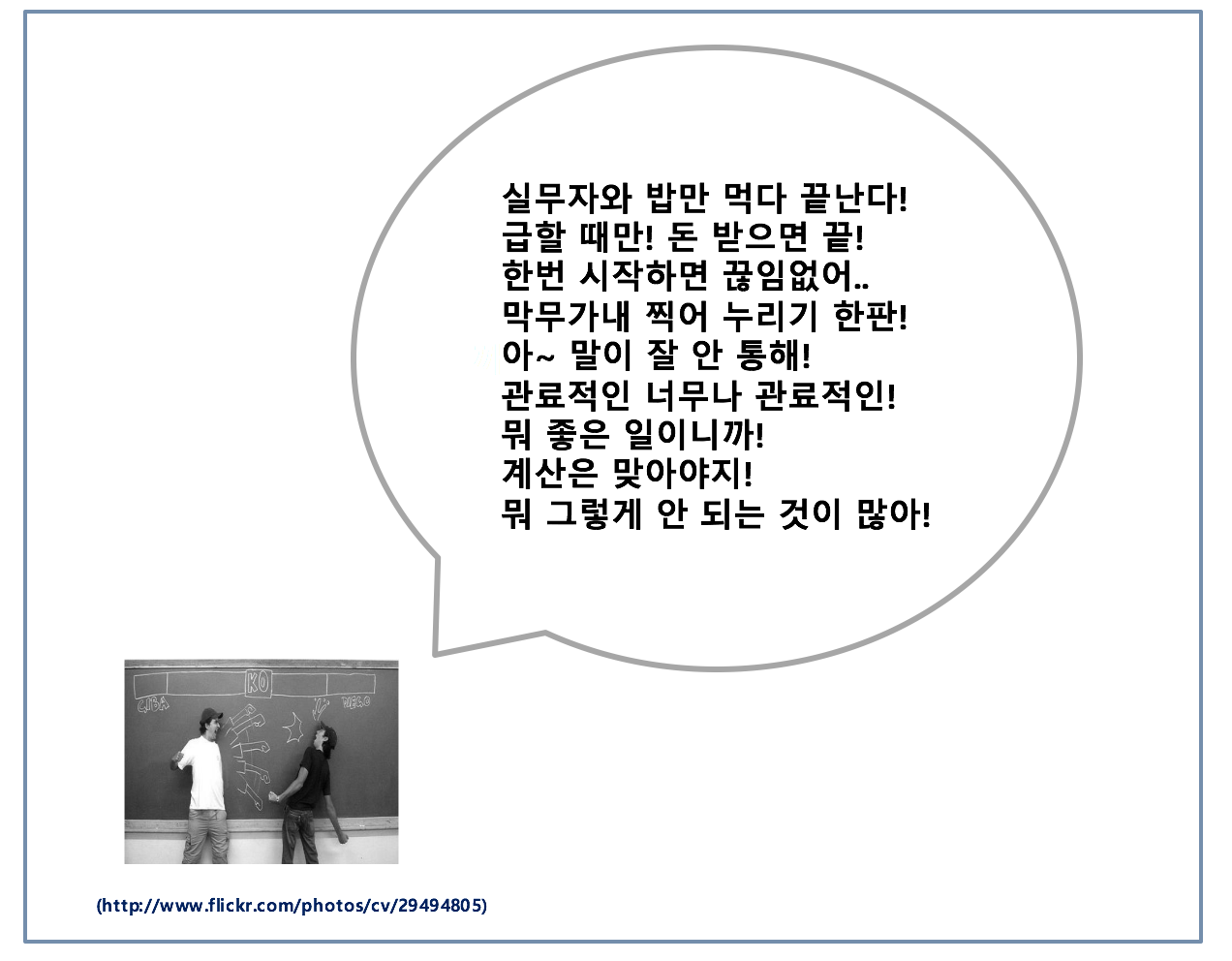 이것은 약간 갑의 입장에서 하는 말인 것 같습니다. 이렇게 하자, 저렇게 하자 했을 때 이런 규정 때문에 안된다, 클라이언트 보호 차원에서 안된다, 협의된 내용이 아니다 등등으로 거절당하는 경우입니다. 이 불만은 사실 잘 이해가 안 됩니다.