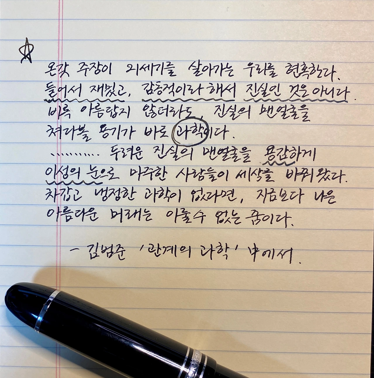 고등학교 때 나는 문과를 선택했지만 수학을 참 좋아했다. 수학을 제법 잘했다. 원리를 이해하고, 이를 응용하면 정확한 답이 찾아지는 것이 참 좋았다. 문과생들은 물리, 생물, 화학, 지구과학 중 한 과목을 선택해서 대학입시 시험을 치렀었는데, 나는 물리와 화학을 두고 고민했다. 대부분의 문과생들이 생물을 선택했다. 나는 화학을 최종 선택했는데, 전교 문과생 중 정말 몇 명 안 되는 학생이 선택했다. 나는 외워야 하는 생물이 참 싫었다. 아직도 왜 생물이 외우는 과목이 되었는지 잘 모르겠지만.... 아무튼 나는 수식과 실험, 증명을 통해 문제를 풀어가는 군더더기 없는 수학과 과학 과목이 좋았다.