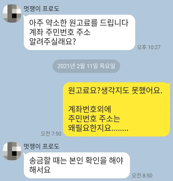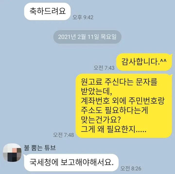 축하한다는 말과 함께 아주 약소한 원고료를 드리니 계좌번호, 주민번호, 주소도 알려달라는.
